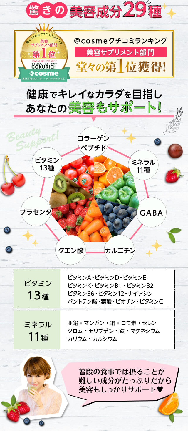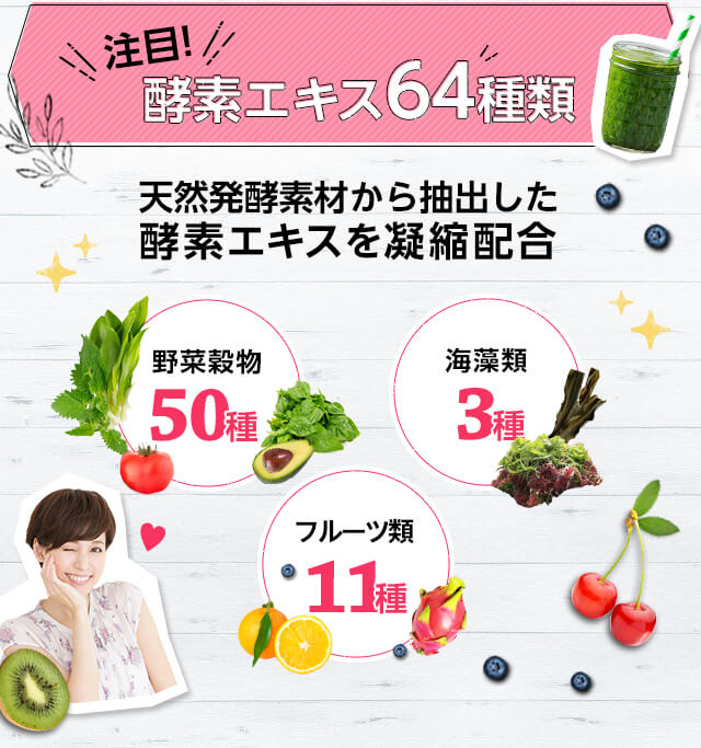 | 原材料名 | 難消化性デキストリン、還元麦芽糖水飴、クマザサ粉末、緑茶粉末、デキストリン、 サイリウムハスク粉末、ケール粉末、ドロマイト、マンゴピューレ、グルコマンナン、フィッシュコラーゲンペプチド(ゼラチンを含む)、 パパイヤ粉末、GABA、ドラゴンフルーツピューレ粉末、アフリカマンゴノキエキス粉末、 混合ハーブエキス(グアバ、ホーリーバジル、セスバニア、レモン皮、アムラ、ベニノキ種子)、 L-カルニチンフマル酸塩、豚プラセンタエキス粉末、α-リポ酸、L-オルニチン、 植物発酵物(小麦、リンゴ、バナナを含む)、コエンザイムQ10/増粘剤(キサンタンガム)、 クエン酸、香料、甘味料(アスパルテーム・L-フェニルアラニン)、微粒二酸化ケイ素、L-ロイシン、 L-バリン、L-イソロイシン、サイクロデキストリン |